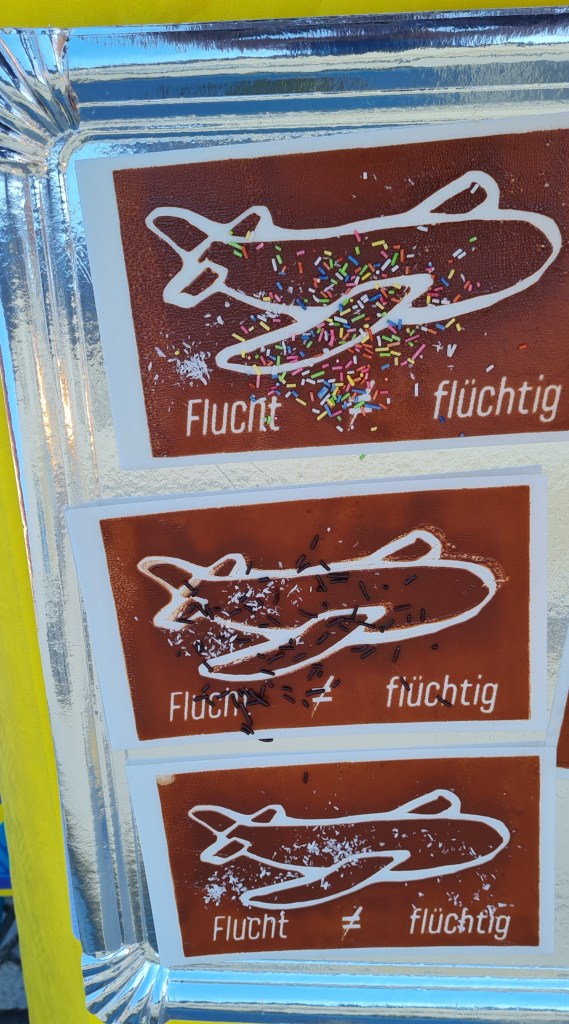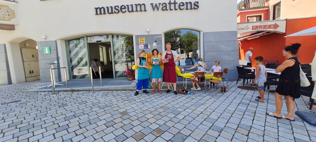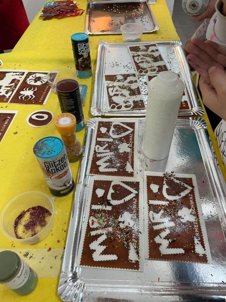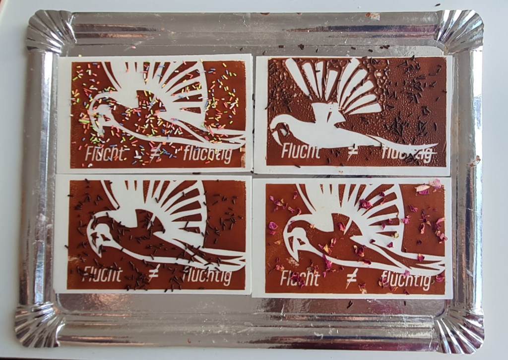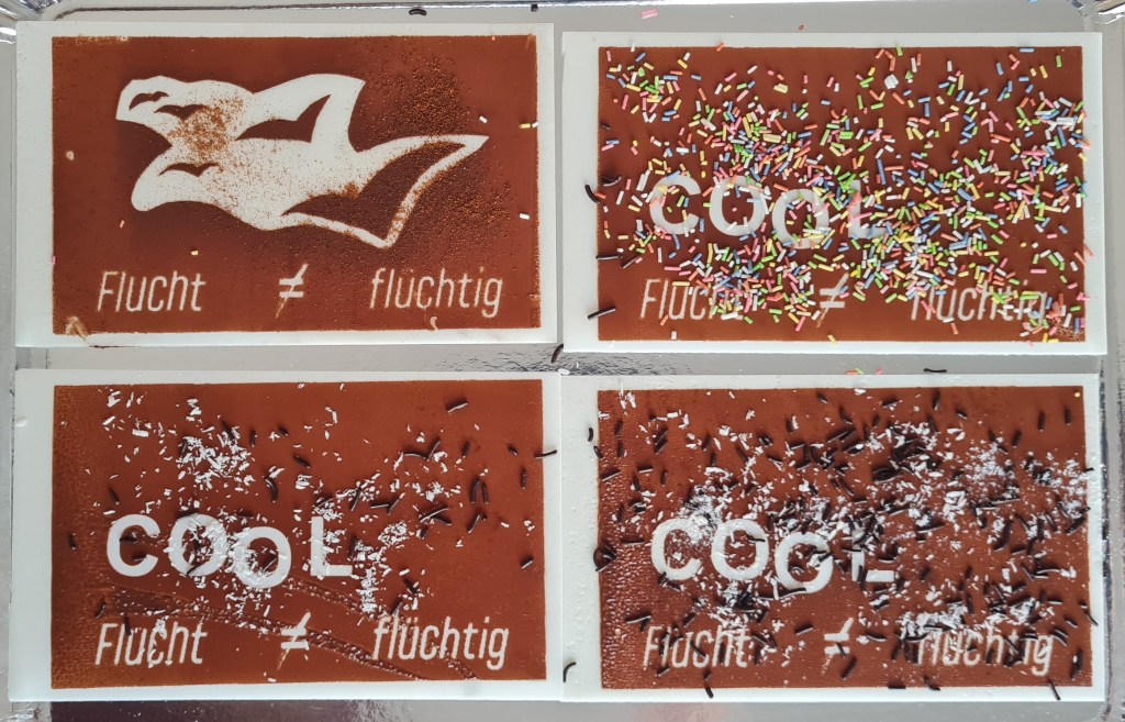 Gestalte dein eigenes Design aus Schokolade! Der Künstlern Ype Limburg und Kristina Kapeljuh zaubern mit euch „Choko-Designs“ aus u.a. Motiven der Ausstellung „Flucht ist nicht flüchtig“.  Dabei lernt ihr die Siebdruck-Technik mit flüssiger (veganer) Schokolade auf Esspapier kennen und könnt eure Drucke mit Streusel, Zimt- und Chili-Pulver schmücken. Einmal abgekühlt, kann der Chokodruck in Papiertaschen verpackt mit nach Hause genommen werden.Im Rahmen des Workshops werfen wir auch einen Blick in die Ausstellung „Flucht ist nicht flüchtig“ im Museum Wattens.